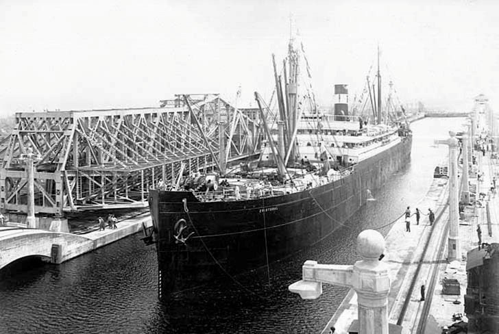 On 24th August 1914, the steamer Pleiades arrived in New York harbour to a water cannon and whistle celebration from all of the tugs and ships in the harbour. She had arrived from San Francisco through the canal with five thousand tonnes of timber and general cargo as the first ship to make the now shorter passage from the west coast. She made her return passage through the canal to San Francisco, the round voyage time taking only half of the previous time via the Magellan Straits. Pleiades was of 3,753 grt and owned by the Luckenbach Steamship Corporation, having been built in 1899 by the Sparrows Point yard of the Maryland Steel Corporation, with triple expansion steam engines from their Baltimore plant.