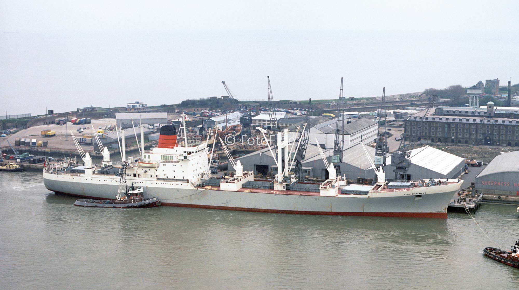 The 16,275grt Port Chalmers, seen here at Sheerness in 1975, was built in 1968 by Alexander Stephen at Linthouse. in 1982 she was transferred to sister company Brocklebanks and renamed Manaar, and in 1983 she was sold to Mint Crown Shipping of Piraeus and renamed golden glory. She was broken up at Shanghai where she arrived on 13th June 1985 after a relatively short career.