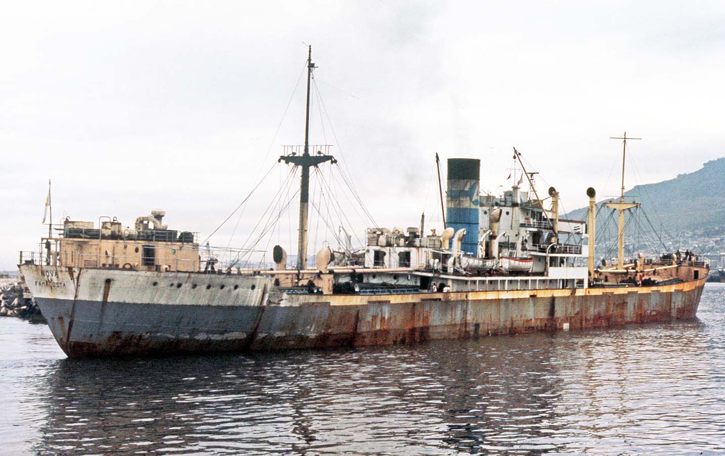 Purchased while in lay up in 1983 but without initially changing her name, the 22,600 dwt bulk carrier San Vincenzo, built at Muggiano, La Spezia, in 1965 as Portoria for Genoa owners which had traded as Garden Gemini between 1974 and 1979 and then as San Vincenzo (above) by Vincenzo Frulio of Naples. renamed Argyroula in 1984 under the nominal ownership of Rio Pardo Cia. Nav. S.A., she finally sailed from Piraeus on 10th June 1985 for a single loaded voyage to India before being beached at Alang on 12th August 1985 to be broken up.