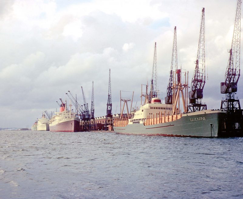 To her left is Cunard Line’s 22,592grt Carmania. She was built in 1954 by John Brown at Clydebank as the Saxonia, being renamed Carmania 1963. In 1973 she joined the USSR and was renamed Leonid Sobinov. On 1st October 1999 she arrived at Alang to be broken up.