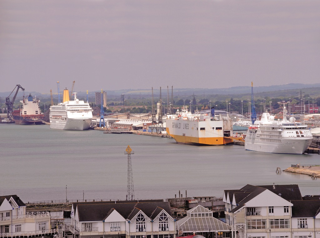 A busy day at Southampton on 9th May 2013. From left to right are the Qingdao Tower of Zodiac Maritime, the Oriana of P&O Cruises, the Grande Italia of Grimaldi and the Silver Cloud of Silversea Cruises.
