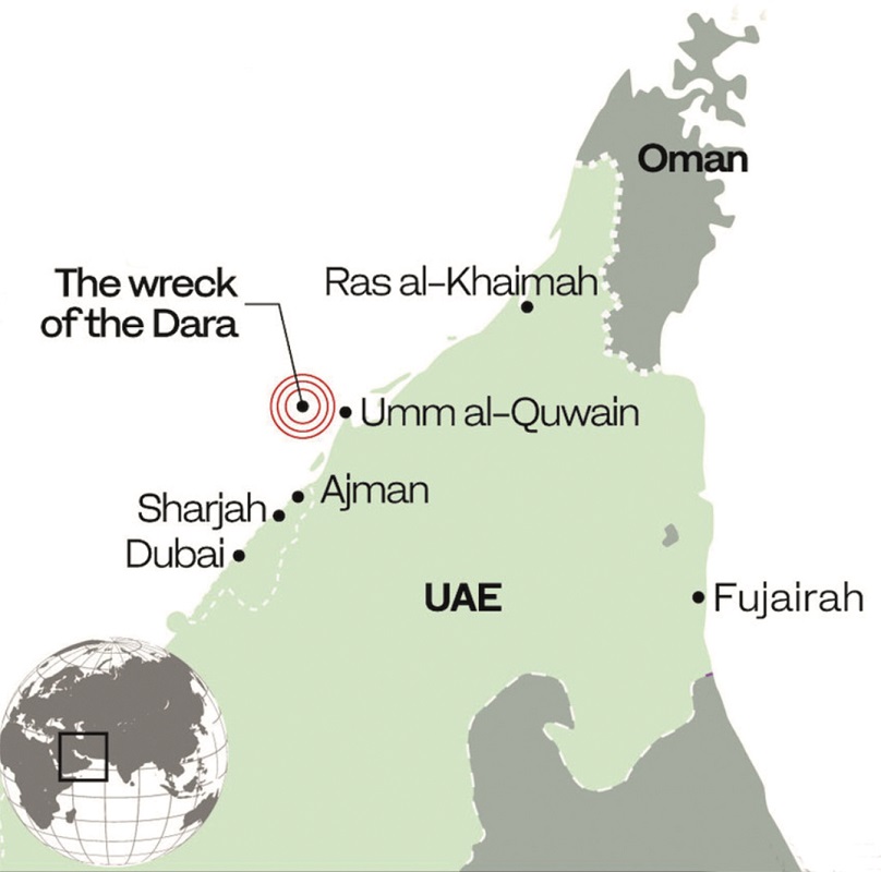 The tragic loss of the passenger ship Dara 62 years ago, was one of the worst peacetime disasters to British shipping since the Titanic. It was made worse because it was a terrorist atrocity, a bomb placed in the second-class accommodation. No one in the United Kingdom seemed interested in the 60th anniversary in June 2021, as though it had never happened. I thought, as the last living officer I should do something, but I was wrong, the chief officer and the assistant purser were still alive! After much thought, and with encouragement from a friend, we flew to Dubai and chartered a motor boat and crew.