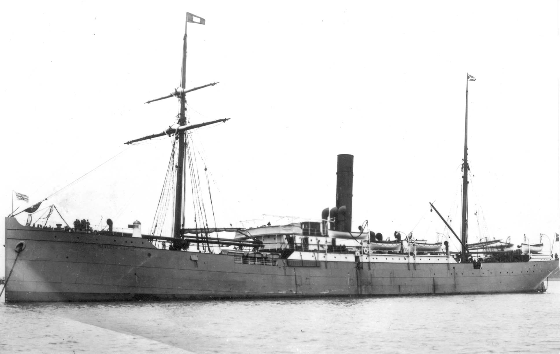 The elegant twin funnelled pair of Kinfauns Castle and Kildonan Castle of 1899 had accommodation for 250 First Class passengers, 175 Second Class passengers, and 140 in Third Class, and had service speeds of seventeen knots from two quadruple expansion steam reciprocating engines driving twin propellers. Unusually, their number three hold derricks were worked off the foremast and not the derrick posts. Kildonan Castle could be identified from her sister by her totally enclosed poop, and was put into service in October 1899 with incomplete passenger accommodation as a troopship carrying three thousand troops on the outbreak of the Boer War.